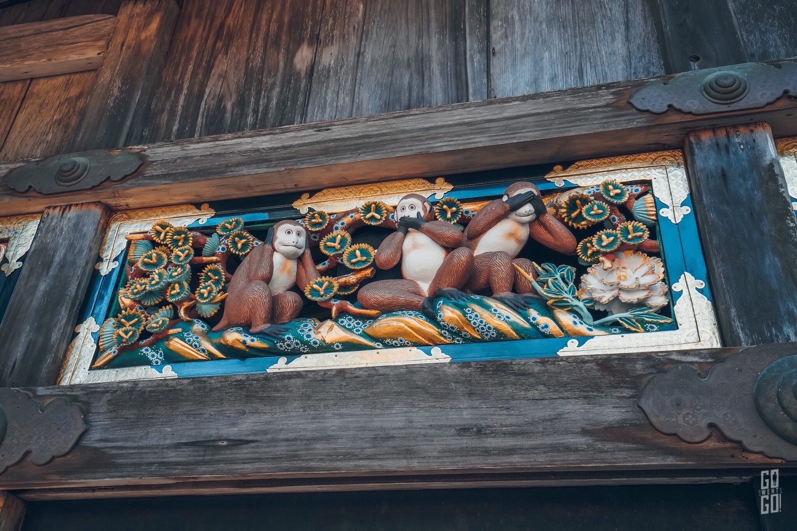 ลิงสามตัวทำท่าปิดตาปิดปากและปิดหู ซึ่งหมายถึงการ “รู้จักควบคุมการมอง ควบคุมการพูด และควบคุมการฟัง”