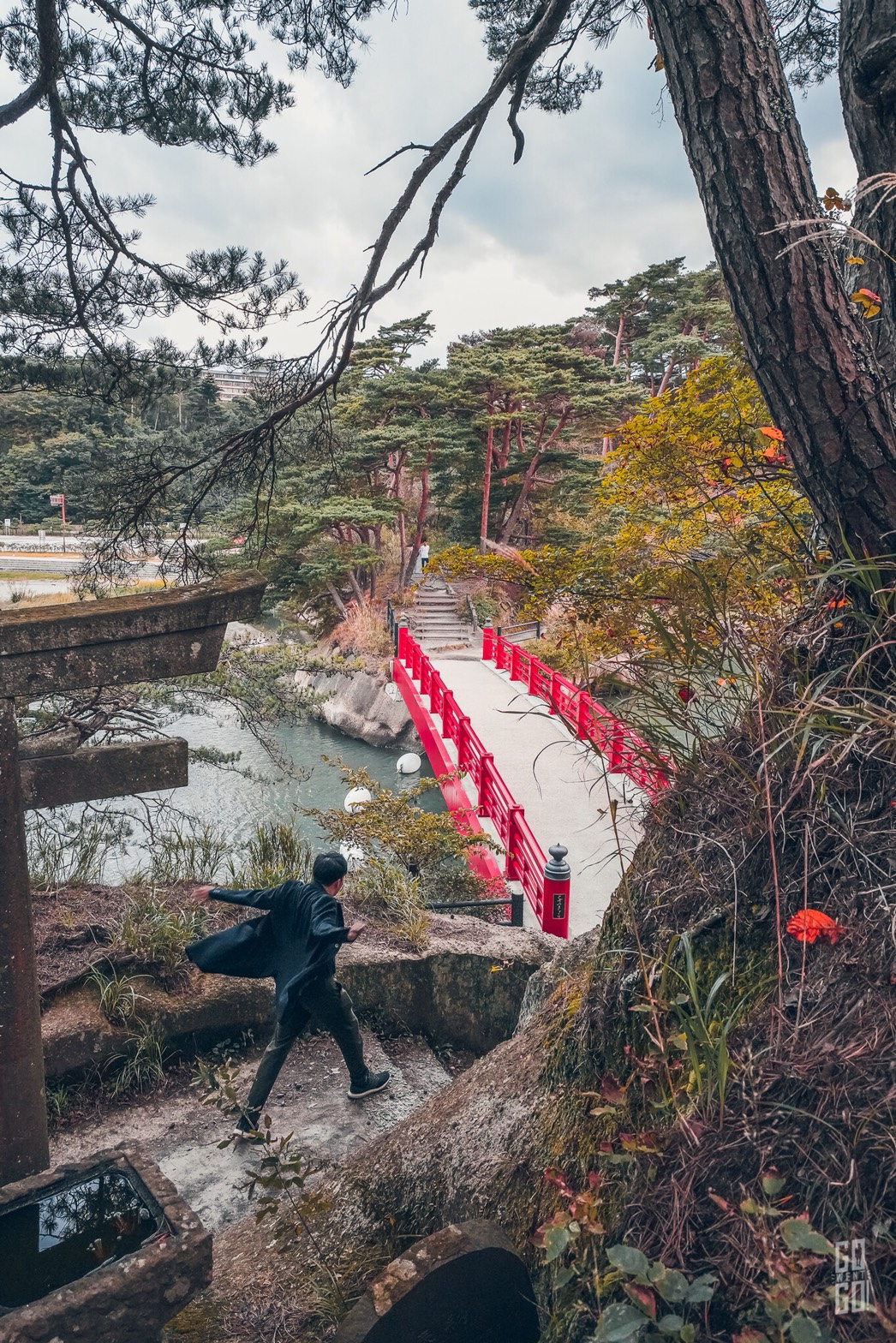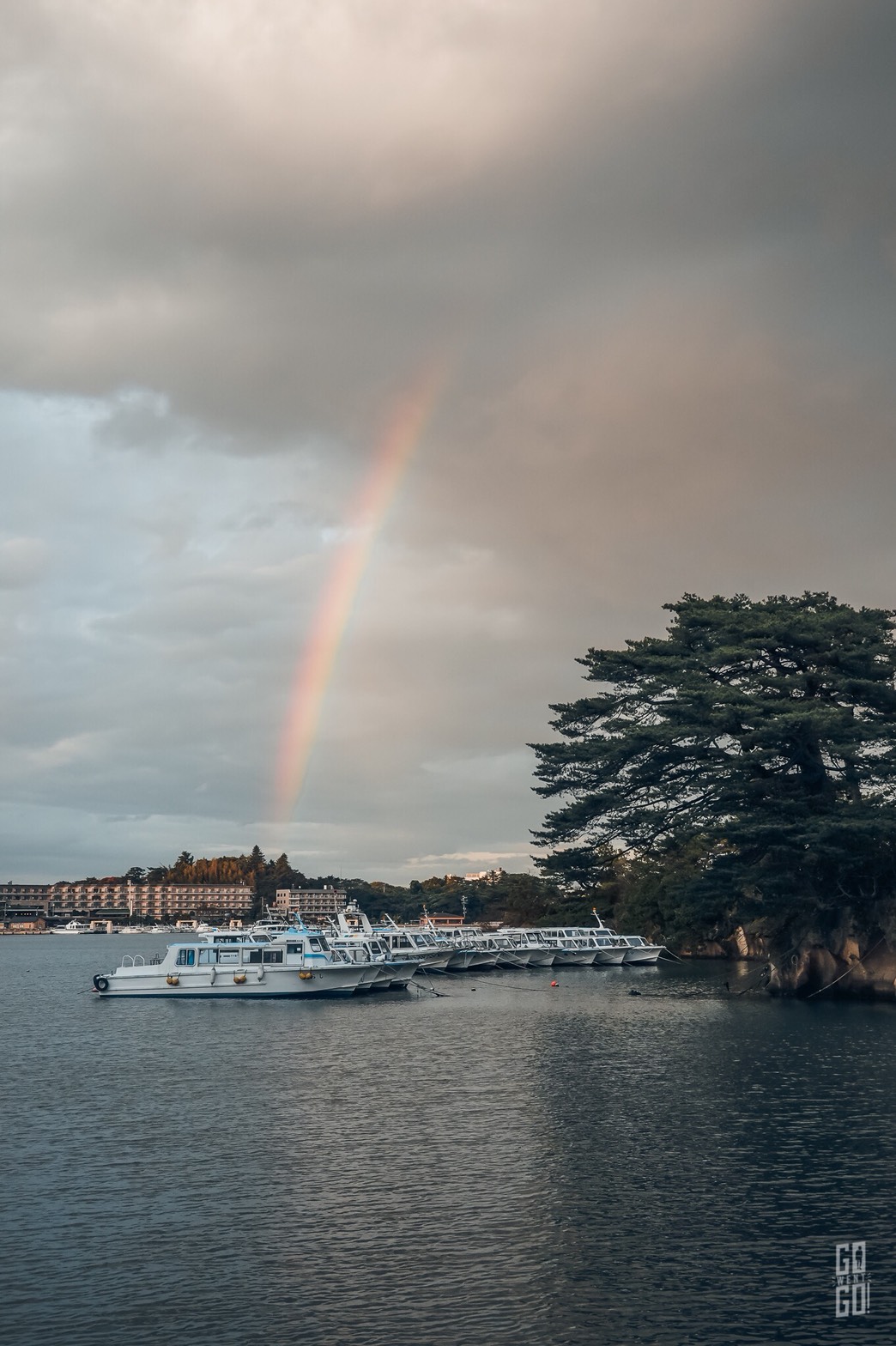 เราเริ่มต้นวันด้วยการไปกินลิ้นวัวแถวย่านอิจิบังโจ หลังจากนั้นเราก็เดินทางไปอ่าวมัตสึชิม่า อ่าวนี้ได้รับการยกย่องว่าเป็นอ่าวที่มีความสวยงามมากที่สุด 1 ใน 3 ของญี่ปุ่นชื่อที่เรียกว่า Nihonsankei ถ้าเดินจากอ่าวขึ้นไปเราจะเห็นสะพานแดง Fukurabashi ที่ถอดยาวเชื่อมระหว่างอ่าวมัตสึชิม่าและเกาะ Fukurashima สะพานสีแดงตัดกับสีฟ้าของน้ำตัดกับสีเขียวของใบไม้บอกเลยว่าสวยมากๆ ตอนที่เราเดินถ่ายรูปกันอยู่ หันไปเห็นสายรุ้งพอดี โอ้ยยยย ดี๊ดี