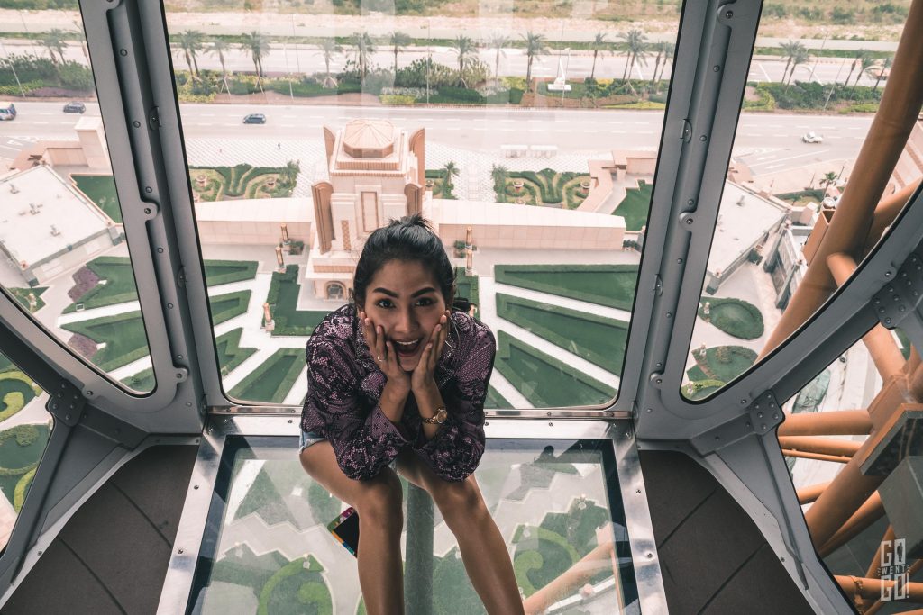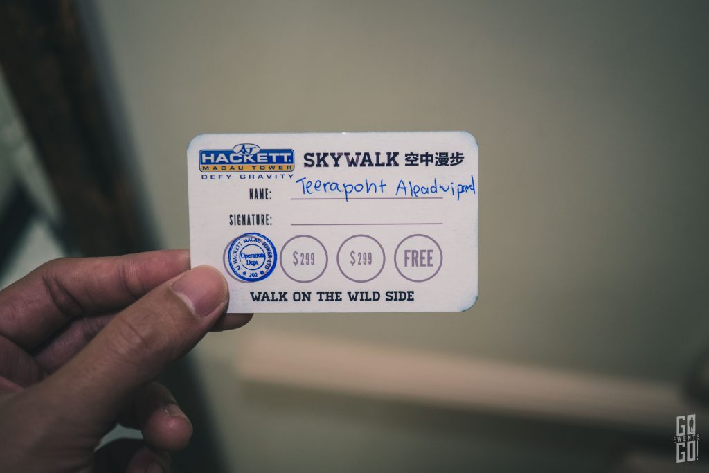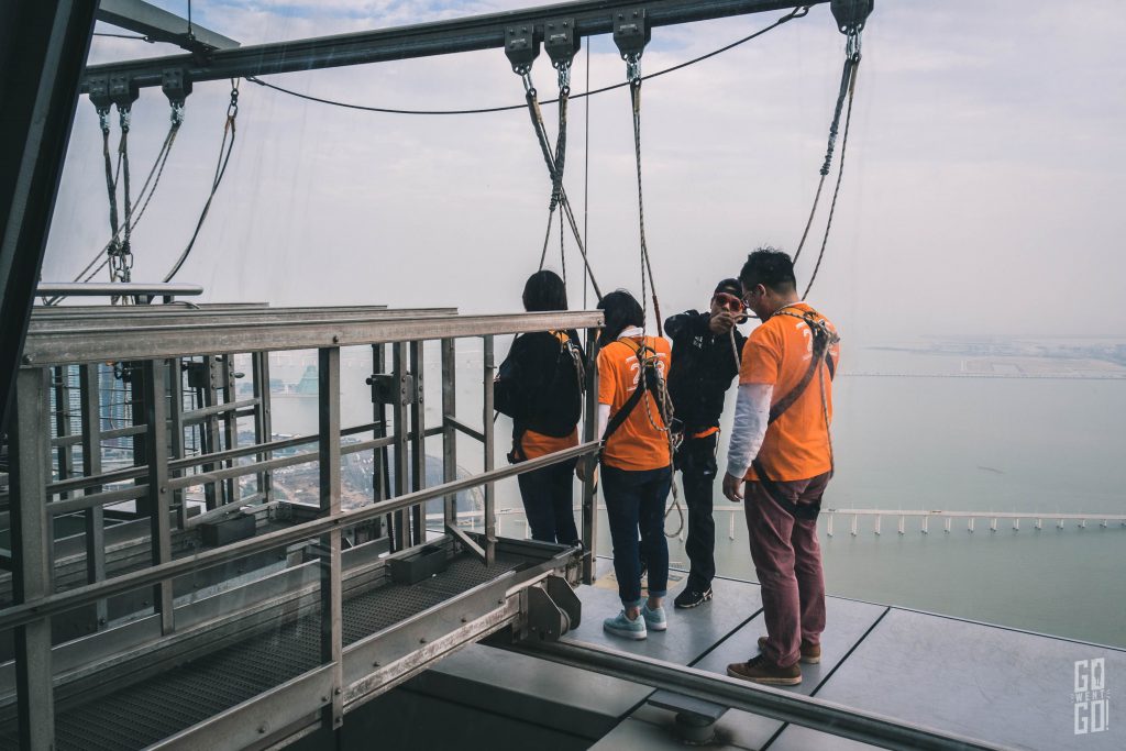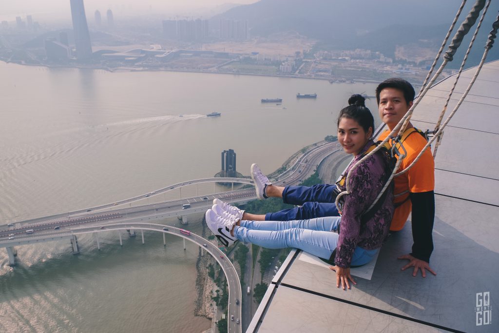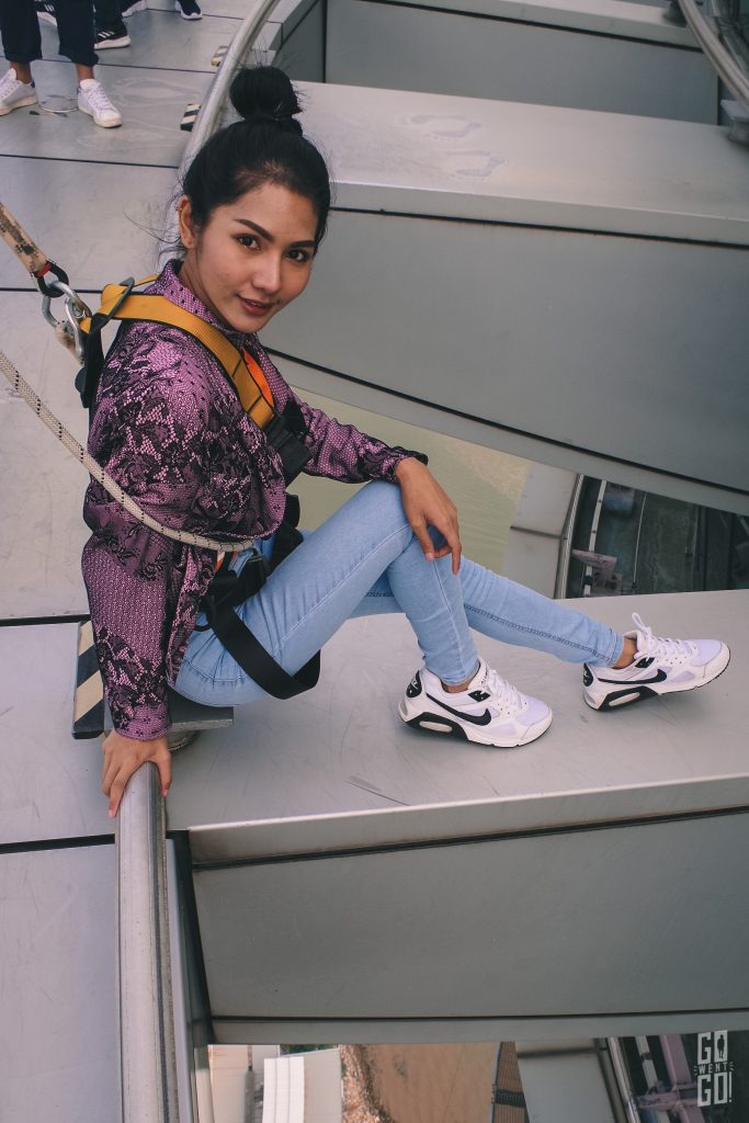 พนักงานพาเดินไปนิดนึงให้หยุดถ่ายรูป ด่านแรก…ให้นั่งบนทางเชื่อมพื้น คือเป็นพื้นที่แบบเล็กๆ เหมือนจะไม่น่ากลัว แต่เสียวมากกก ด่านแรกก็ขาสั่นแล้วจ้าา