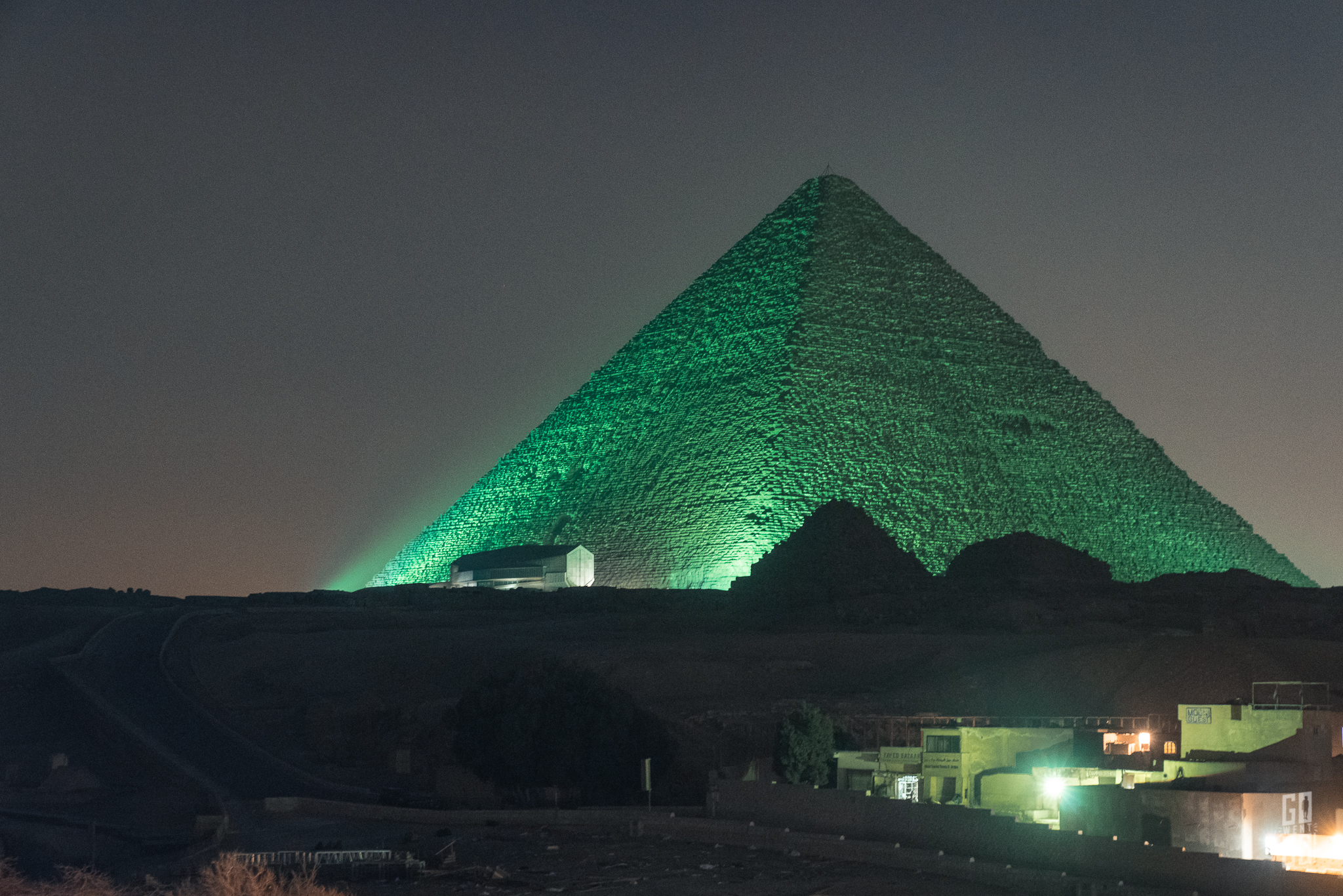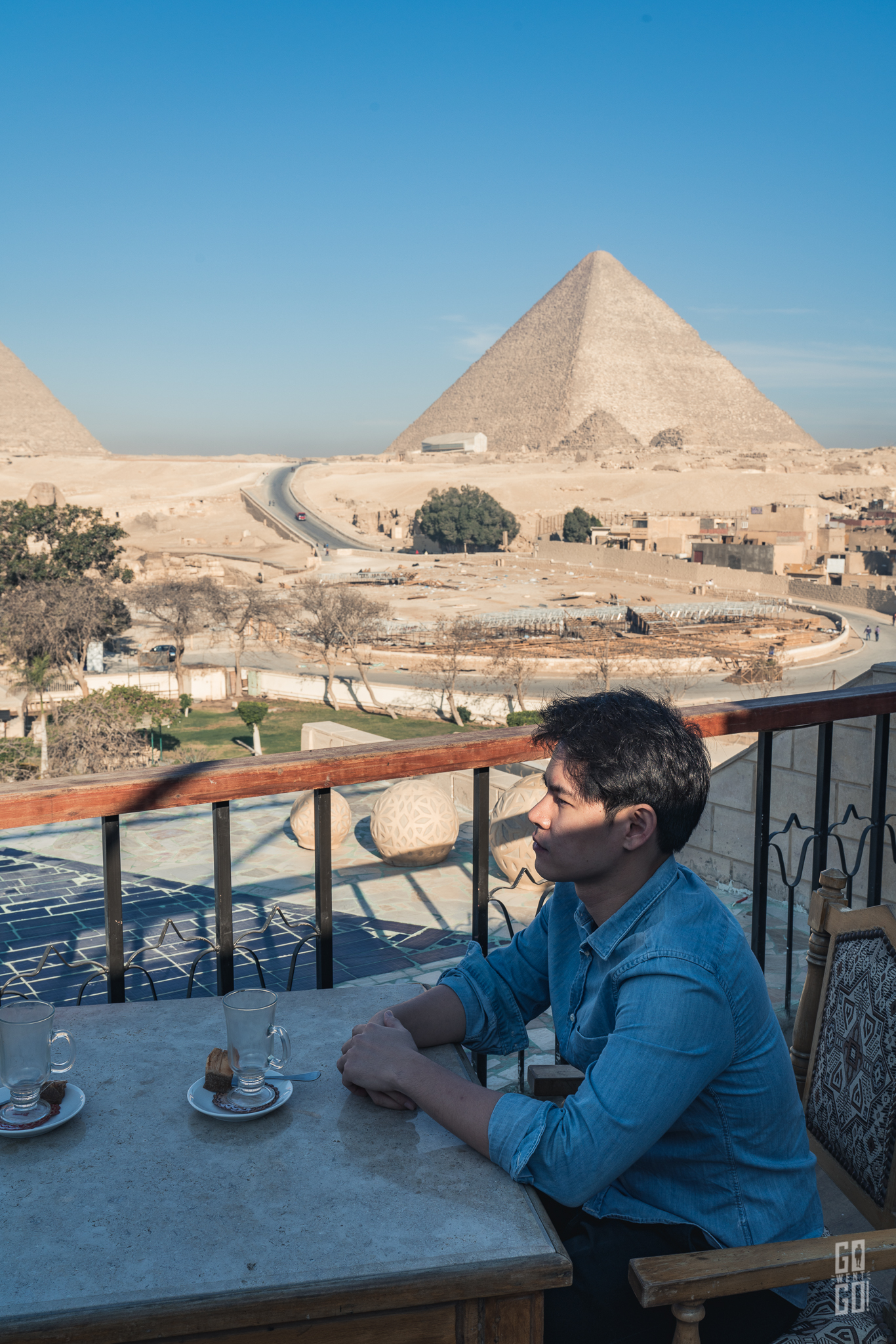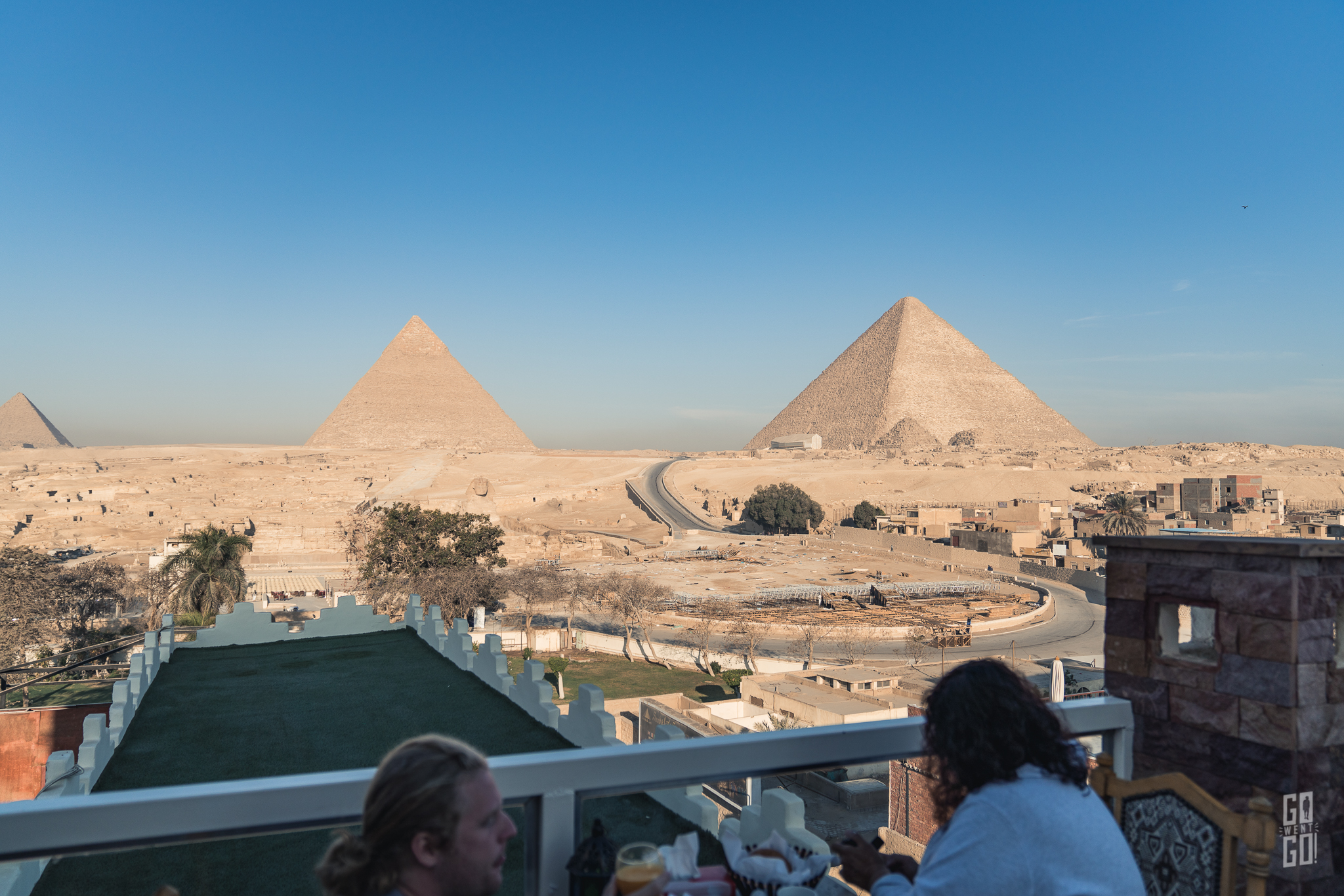 Great Pyramid Inn ที่นี่ราคาตกคืนละ 1310 บาทแต่แลกมาด้วยวิวพันล้านบาทตอนกลางคืนไม่เท่าไหร่พอตอนเช้านี่ร้องว้าวเลยกลางคืนที่พีระมิด จะมีโชว์แสงเสียงจริงๆไม่ค่อยมีอะไรอ่ะคือใครจะดูต้องเสียเงินเข้าไปด้านในแต่นี่เราดูจากวิวของโรงแรมเลยไม่ต้องเสียเงินใดๆทั้งสิ้น อันนี้ให้ดูวิวตอนกลางคืนที่เรามาถึงโรงแรมก่อน พีระมิดที่ใหญ่ที่สุดอยู่ทางขวามือ คือมหาพีระมิดแห่งกีซ่า (The Great Pyramid of Giza) หรือที่บางคนเรียกว่า พีระมิดคูฟูหรือ พีระมิดคีออปส์ เป็นพีระมิดในประเทศอียิปต์ที่มีความใหญ่โตและเก่าแก่ที่สุด สร้างขึ้นในสมัย ฟาโรห์คูฟู (Khufu) เมื่อประมาณ 4,600 ปี มาแล้ว ใช้เป็นที่เก็บรักษาพระศพ ไว้รอการกลับคืนชีพ ตามความเชื่อของชาวอียิปต์ มหาพีระมิดนี้ได้รับการยกย่องให้เป็นหนึ่งในเจ็ดสิ่งมหัศจรรย์ของโลกยุคโบราณ ที่ยังคงอยู่มาจนถึงปัจจุบัน