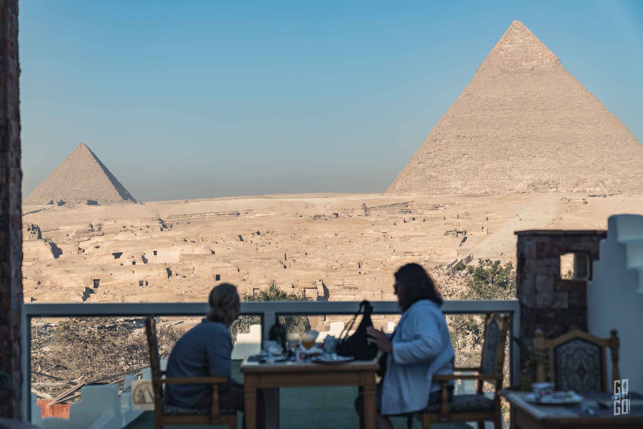 เช้าวันแรกของเราในอียิปต์ เริ่มต้นขึ้นด้วยการนั่งทานอาหารเช้าชิวๆ พร้อมกับชมวิวพีระมิดทั้ง 3 อย่างที่เห็นในภาพ สวยมากๆ ต้องบอกว่าจ่ายหลักพันแต่วิวที่ได้เห็นนี่คือหลักพันล้าน ส่วนอากาศในตอนเช้าก็เย็นๆ แต่แดดยังคงแรงอยู่
