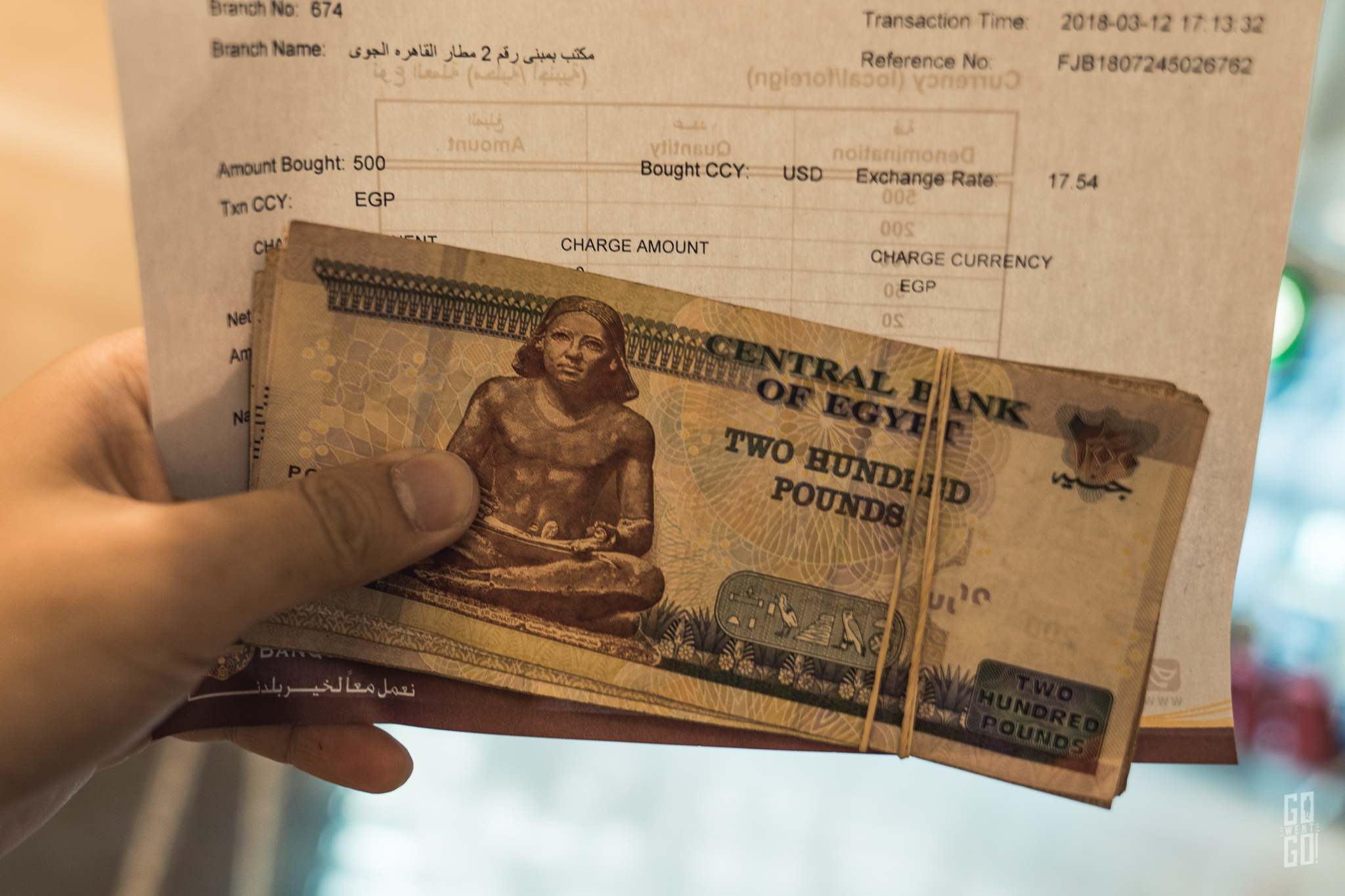 เราออกเดินทางจากไทยไปอียิปต์โดยสายการบิน Etihad ใช้เวลาเดินทางทั้งหมดประมาณ 10 กว่าชั่วโมง รวมเปลี่ยนเครื่องแล้ว ต้องขอบอกเลยว่าที่นี่ตรวจละเอียดจริงๆ เพราะเค้ากลัวเรื่องการก่อการร้าย หลังจากเอากระเป๋าเสร็จแล้วสิ่งต่อไปที่ต้องทำคือการไปแลกเงิน ซึ่งเราจะแลกเงินบาท เป็นเงิน USD จากไทยมาก่อน และเอา USD มาแลกเป็นเงินอียิปต์ที่นี่ เพราะจะได้เรทที่ถูกกว่า เราแลก 500 USD = 8,770 Egyptian pound (EGP) หรือ 20 THB – 11 EGP
