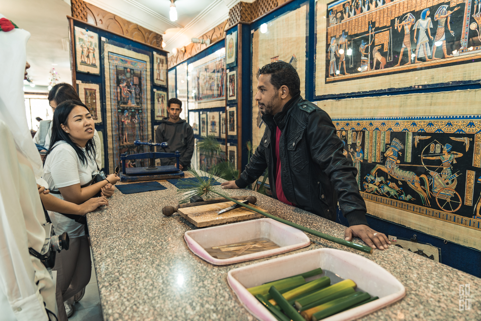 ก่อนไปทานข้าว ทางไกด์พาเรามาดู วิธีทำ กระดาษชนิดแรกของโลก ประวัติศาสตร์เล่าว่ามีการใช้กระดาษครั้งแรกโดยชาวอียิปต์โบราณ ทำมาจากต้นกก ซึ่งมีความทนทานต่อความแห้งแล้งได้ดีเหมาะกับอากาศที่นี่ นี่คืออีกหนึ่งอย่างของที่นี่ ถ้าใครสนใจก็สามารถซื้อกลับบ้านได้ เวลาต่อก็ต่อไปเยอะๆเลย คือมันต่อจนไม่รู้แล้วอ่ะว่าราคาจริงๆมันควรกี่บาท